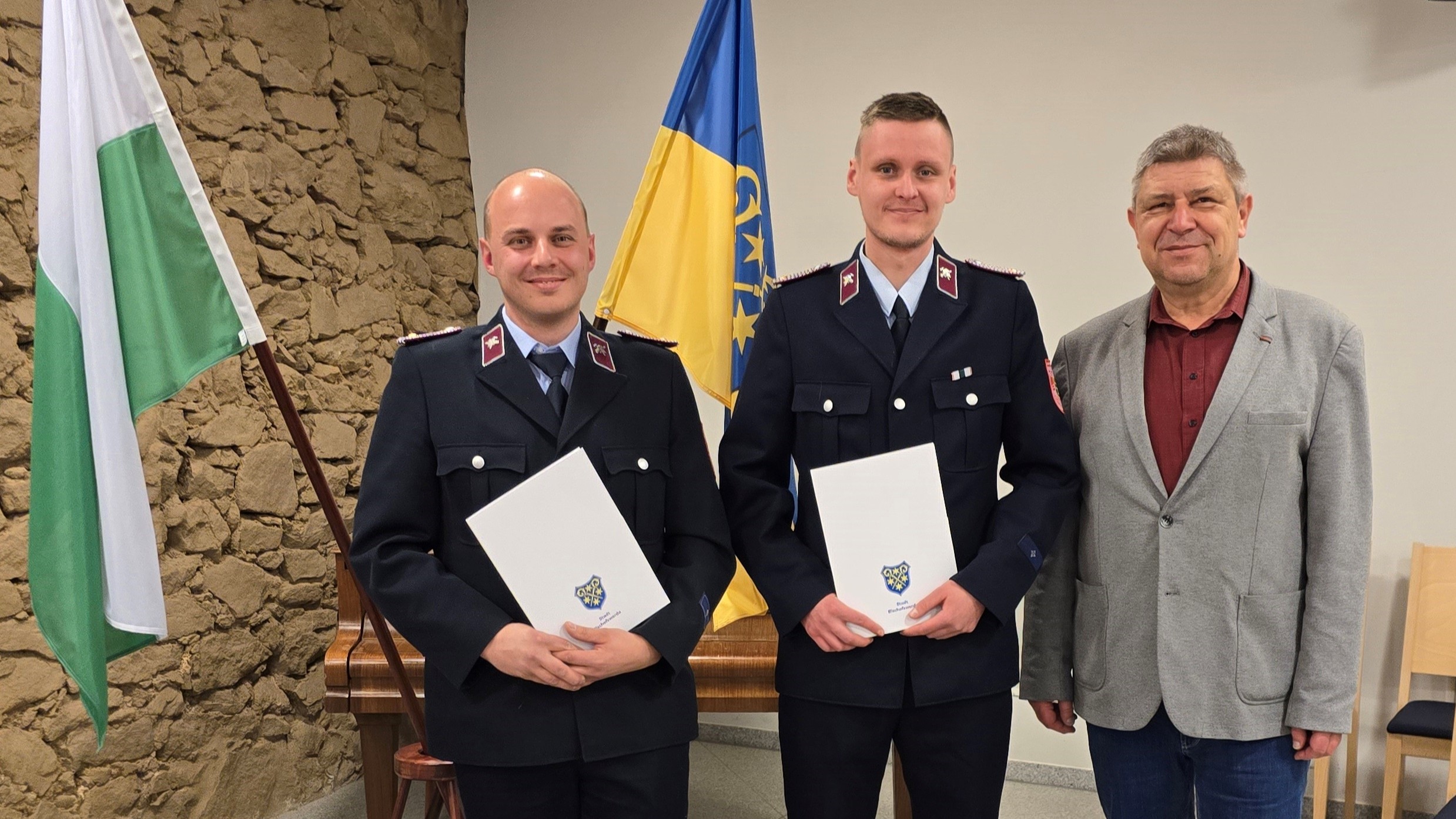 Bei der Ortsfeuerwehr in Bischofswerda gibt es eine neue kommissarische Führung. Wie die Stadtverwaltung mitteilt, wurde Robert Samsa zum Ortswehrleiter gewählt, Martin Protze zu seinem Stellvertreter. Da beiden noch die notwendige Ausbildung zum Verbandsführer fehlt, hat der Stadtrat sie vorerst für zwei Jahre eingesetzt. Oberbürgermeister Holm Große überreichte ihnen die Ernennungsurkunden. Die reguläre Bestellung soll nach Abschluss der Ausbildung erfolgen.(pm/cb)