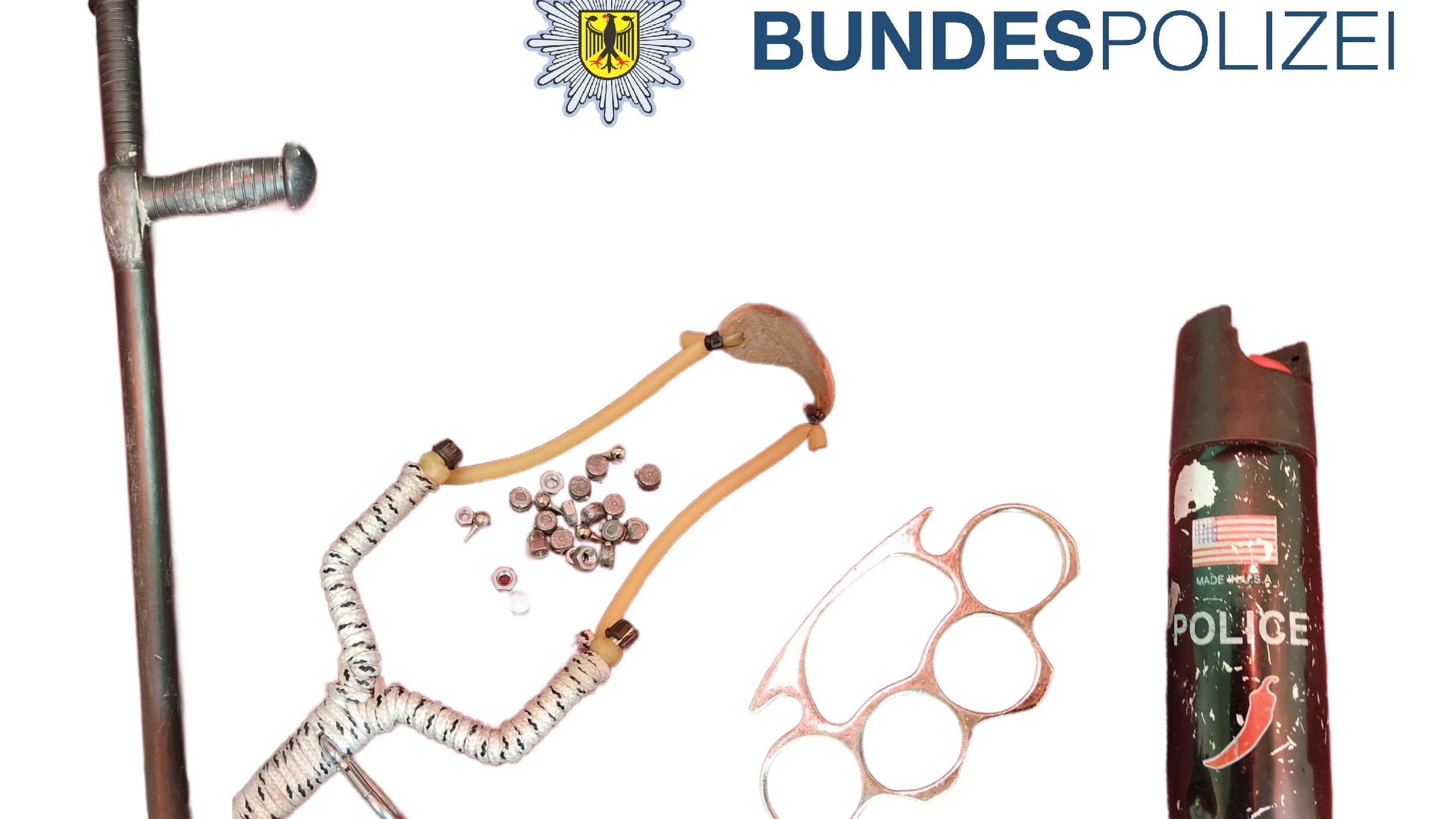mitgeführten Schlagstock , eine Schleuder , mehrere Schlagringe und