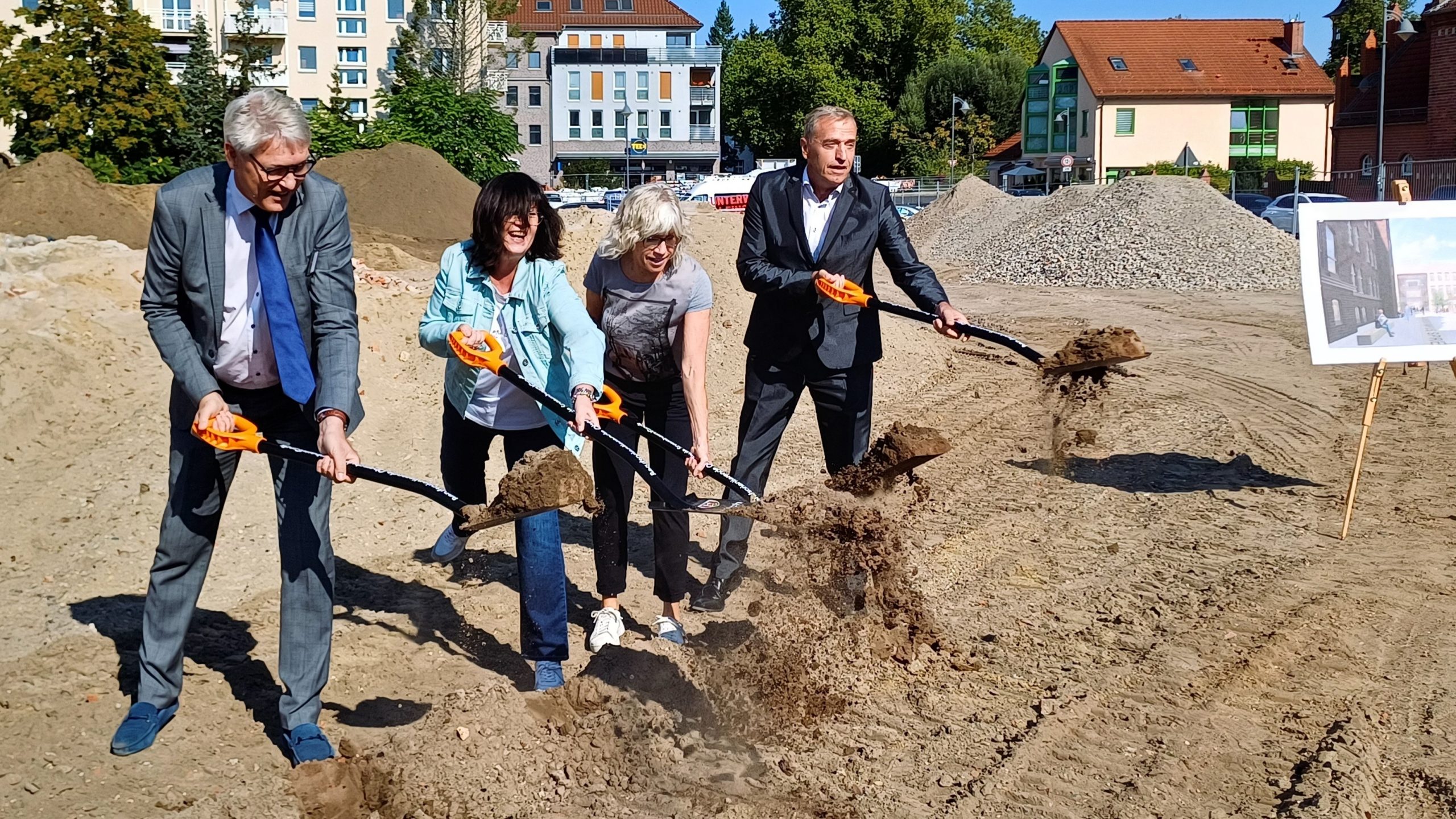 Mit einem offiziellen Spatenstich ist der Bau der Berufsorientierenden Oberschule an der Wirthstraße gestartet. Bürgermeisterin Christine Herntier, Vertreter des Landkreises und der Schulleiter hoben das Projekt als zukunftsweisende Investition in die Bildung der Stadt hervor. Rund 33,6 Millionen Euro werden in den Neubau investiert, die Bauzeit soll etwa zwei Jahre betragen. Der Campus entsteht neben dem denkmalgeschützten Altbau, der weiterhin genutzt wird. Geplant ist ein moderner Bau mit bis zu drei Etagen, Fachräumen, einer Dreifeld-Sporthalle, einer Mensa und einem Glas-Atrium als Mittelpunkt.(pm/ah)